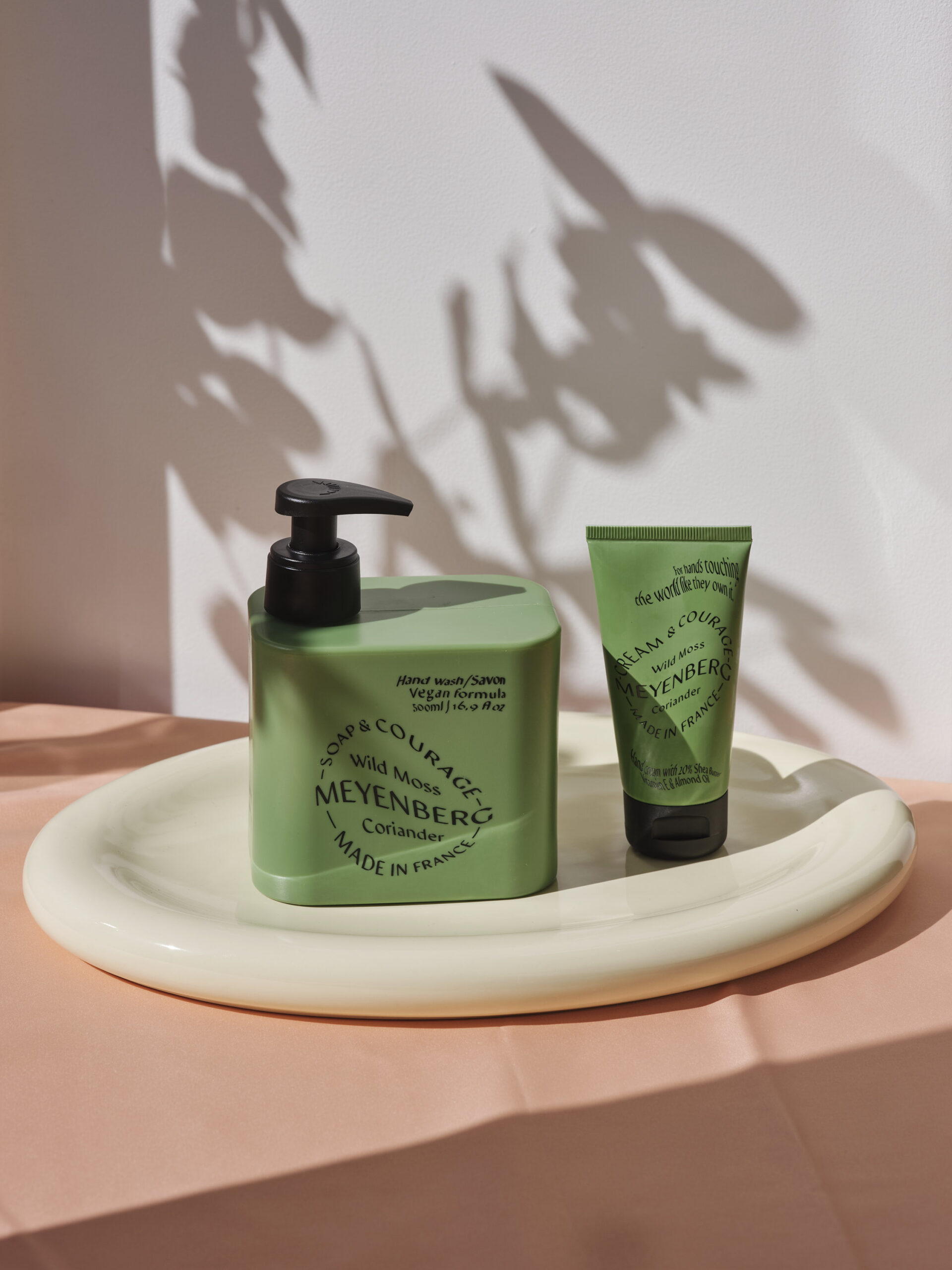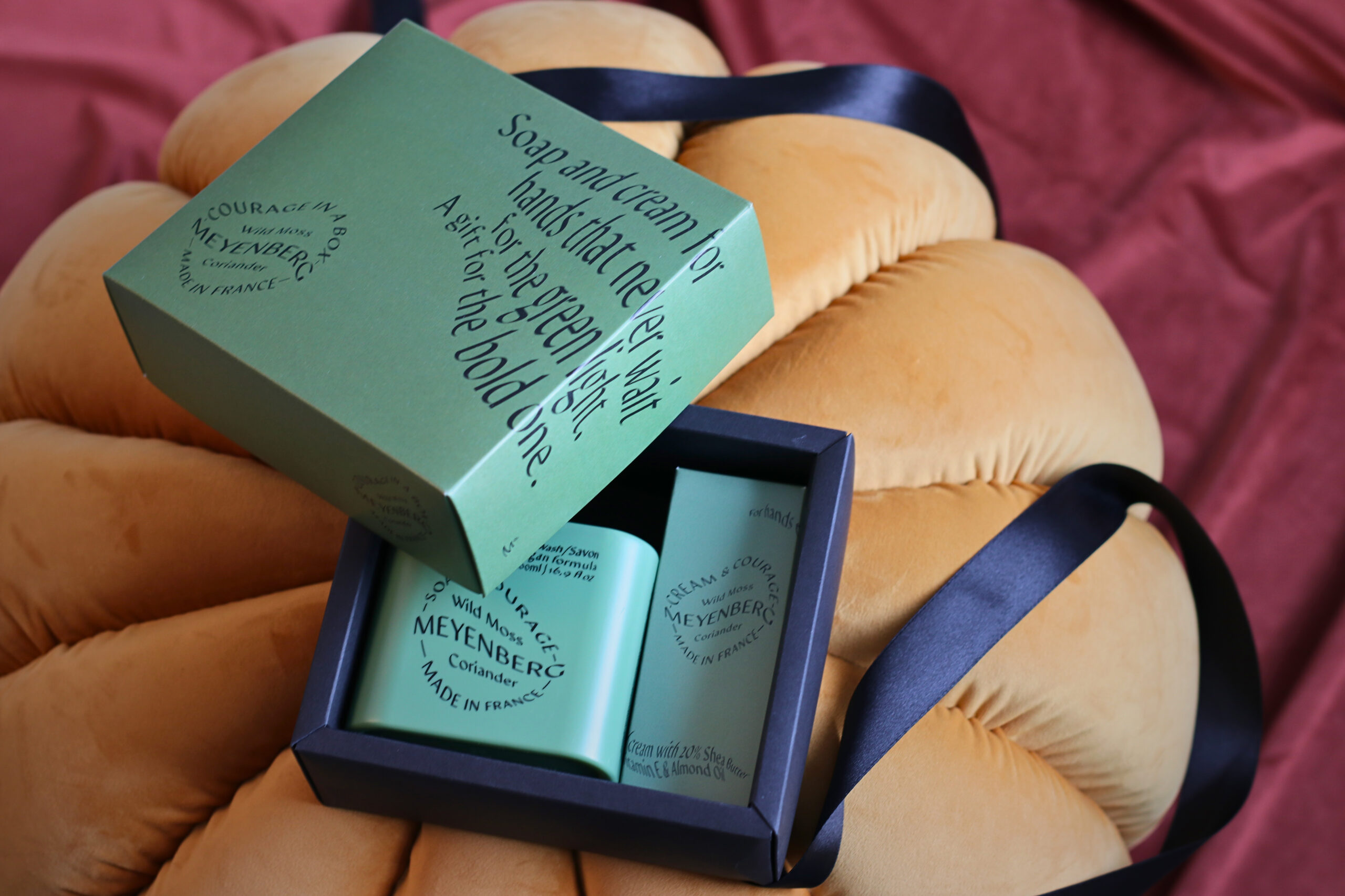 En elegant presentask med vår handtvål och handkräm i doften Courage – en frisk, djup och örtig kombination av mossa, eukalyptus, koriander och rabarber, med rökiga undertoner av cederträ.